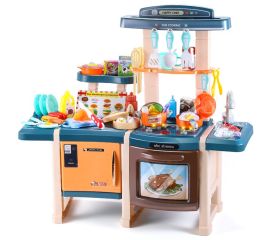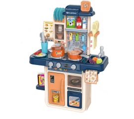 Bucatarie Dubla Completa Multifunctionala Karemi, Chiuveta cu Circuit de Apa, Masina de Spalat Vase, Cuptor, Oala sub Presiune, Ustensile, Produse, Legume, Lumini si Sunete, 42 piese, Albastru multicolor