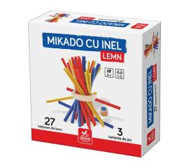 Joc educativ Mikado cu inel Mikado cu inel este un joc de societate asemanator jocul clasic Mikado (Marocoo), in care betisoarele sunt tinute in pozitie verticala de un inel. Scopul este de a scoate cat mai multe betisoare fara ca structura sa cada. Jocul mai include si un zar...