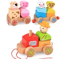 Trenulet Din Lemn De Tras Cu Animale Ferma Si Forme Geometrice Karemi, multicolora Acest trenulet de tras va devenii jucaria preferata a copilului tau! Trenuletul este format din locomotiva si doua vagoane detasabile . Include 5 animalute colorate si forme geometrice. Ordinea vagoanelor...