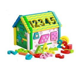 Casuta din lemn colorata cu maner Karemi , bile, figurine, forme geometrice si cifre