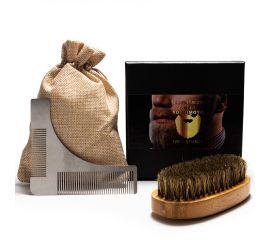 Seturile mai contin si pieptene dublu din lemn dur care ajuta la dispersarea in mod egal a cantitatii de balsam sau ceara aplicata pe barba si descurca nodurile; perie din lemn dur si par natural de mistret care nu doar ca stilizeaza firele barbii, dar totodata sporeste si circulatia sangelui de la nivelui fetei, ceea ce va face ca barba sa creasca mai repede; foarfeca din otel care are precizie sporita si este usor de manevrat, fara riscul de a te taia. Ideala pentru mustata, barba sau frizura.
