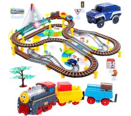 Mega circuit 2 in 1 Karemi, cu 192 piese, pista de cursa dubla, cu locomotiva si autovehicul, pod iluminat electric