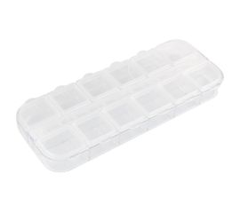 Cutie de depozitare din plastic, 12 compartimente Cutia depozitare din plastic contine 14 spatii compacte si sigure. Are dimensiunile perfecte pentru depozitarea elementelor decorative pentru unghii: sclipici, pietricele, paiete, pudra colorata etc.