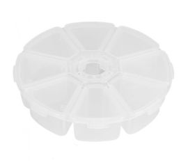 Cutie de depozitare rotunda, transparenta, 8 compartimente  Cutia de plastic etajata este ideala pentru decoratiuni si accesorii unghii (sclipici, paiete, strasuri, catifea, fimo etc.). Aceasta a fost special conceputa pentru ca tu sa iti poti tine cele mai folosite decoratiuni si...